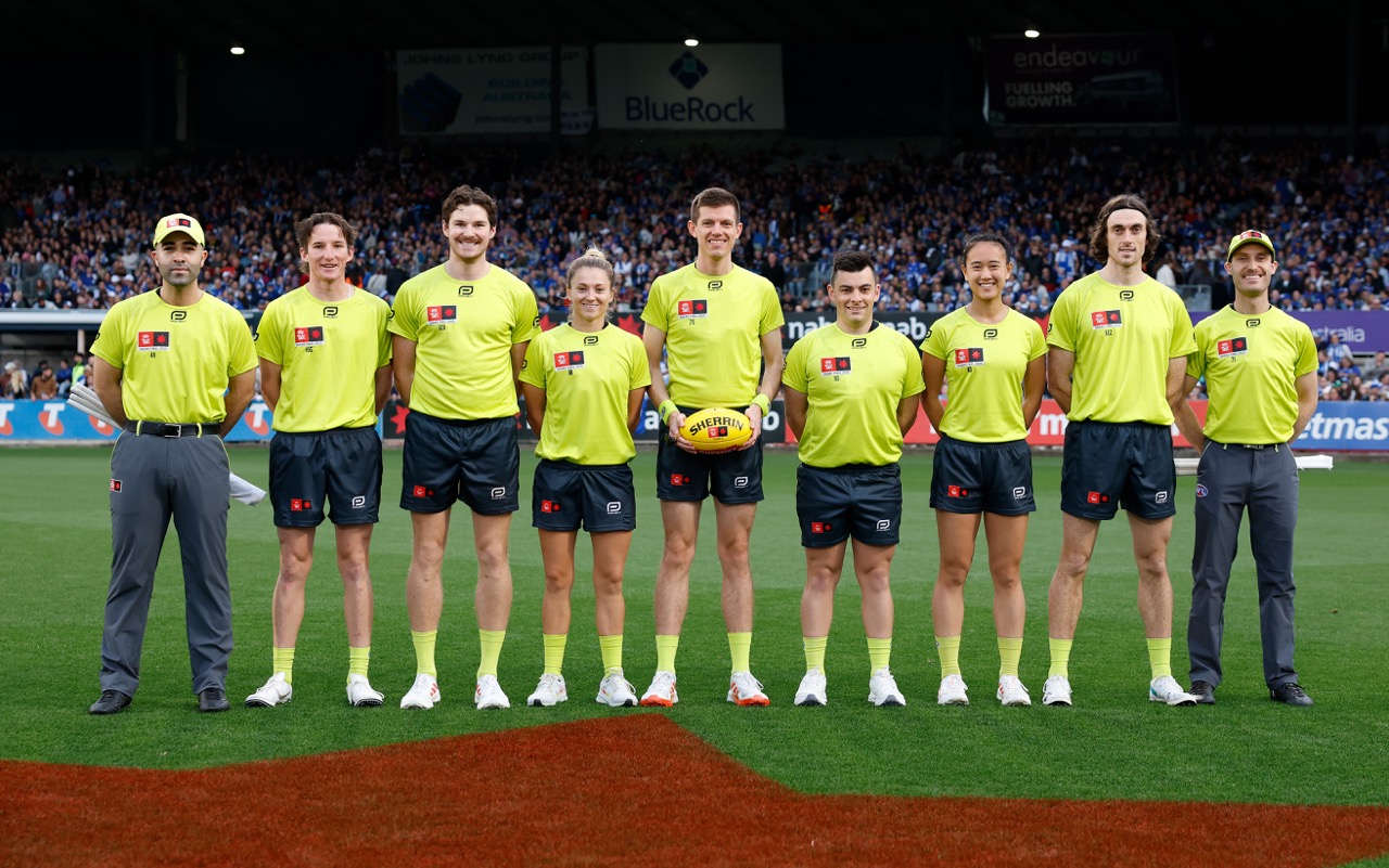 Boundary umpires Riley Guerin, Cooper Ranie, Madeline Luma and Sam Beer, each officiated their first AFLW Grand final, with Mitchell O’Neill being the emergency boundary umpire.